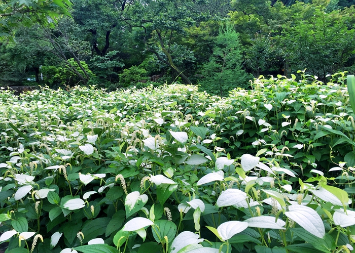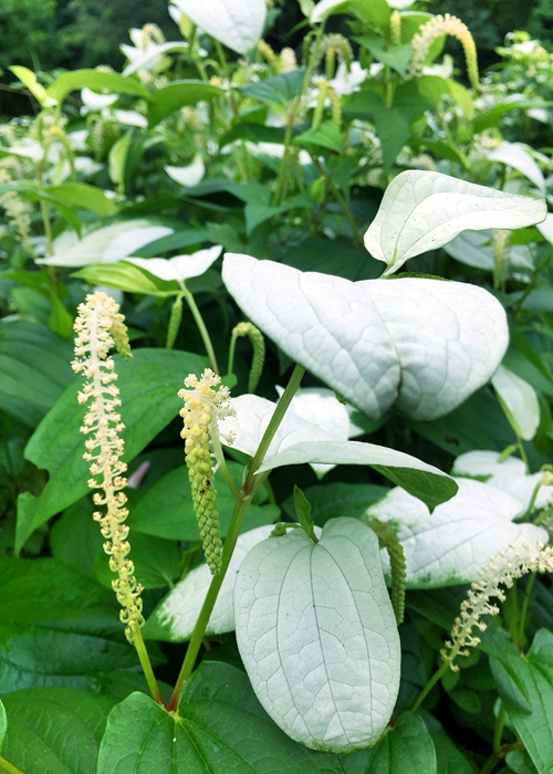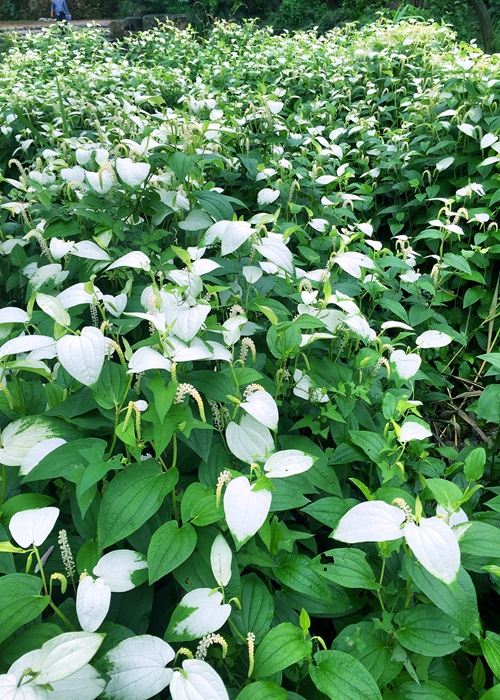 入草药园,慢行三分有余,遂见湖中小岛绿影中白花丛生。走近仔细一瞧,方才发现那雪白的竟是花瓣状的叶而并非花。比起硕大的叶片,花序倒显得乖巧、娇弱,羞答答地弓着“小腰”,低低垂下头。如少女般含羞,又身段娇柔。其实叶不全白:植株下方叶全绿,越近株头越发白,一些叶全白,另一些则绿白相间。翻书一查,这名字倒不似外形那么美好了:三白草,学名:Saururus chinensis,三白草科,三白草属。别名:唐本草、塘边藕。湿生草本,多生于山谷、沟边、溪旁或地湿的地方,丛生时蔚为壮观,独处也别具一格。究竟为何叫三白草呢?