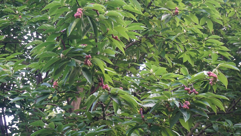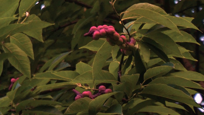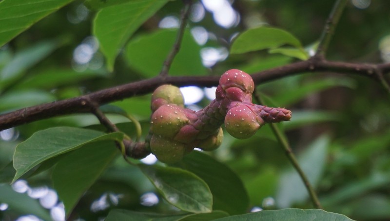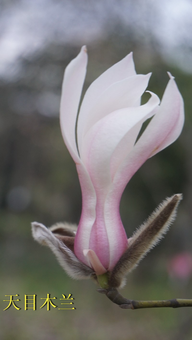 天目木兰Magnolia amoena零星分布于浙江临安西天目山等地,以及江苏和安徽部分地方海拔200-1000米的丘陵低山。它是木兰科的落叶乔木,花开早春,无叶片时,很多人会误认为是白玉兰或‘山’玉兰。叶片倒披针状长椭圆,长尾尖,小枝青绿纤细。花瓣倒披针形或匙形。花径6cm。9片。外轮3片成短小长条形。聚合果圆柱形,有时候有的蓇葖果发育不全而成不规则形。上海的花期3月,果实7月变红,种子8月成熟,有假种皮橙红色,是木兰科植物中果实变色最早的一种。上海植物园内木兰园和展览温室(一)西侧均有栽植。