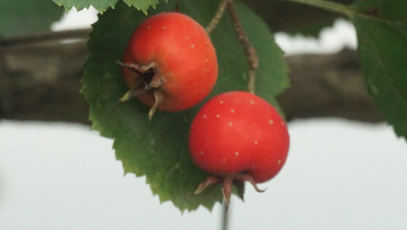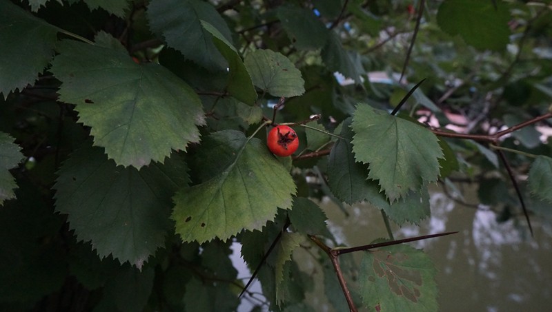 梅叶山楂Crataegus prunifolia蔷薇科的落叶小乔木。本来红果的时间就早,今年就更是在小暑到来之时就红果了,这就是在蔷薇园的西侧桥北的一株长刺的圆叶乔木。一般山楂 Crataegus pinnatifida要9月上中旬才果红,梅叶山楂一般在立秋前后出现红果现象,今年是出乎意料地早,照这样,过了三伏天就要落完红果了。梅叶山楂是原产欧洲,通过种子交换得到引种的。其叶片是宽椭圆状卵形,边缘有重锯齿,有托叶刺,长达5cm。叶片形态与普通山楂(Crataegus pinnatifida)差异较大,果实的形态和大小与野山楂Crataegus cuneata相似。