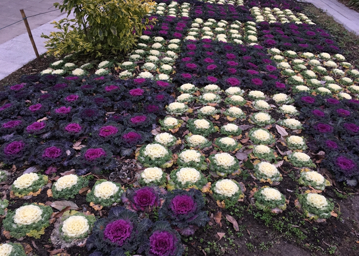 6、羽衣甘蓝:二年生草本,为食用甘蓝(卷心菜、包菜)的园艺变种。栽培一年植株经冬季低温,于翌年春季开花、结实。羽衣甘蓝由于品种不同,叶色丰富多变,叶形也不尽相同,叶缘有紫红、绿、红、粉等颜色,叶面则有淡黄、绿等颜色,整个植株形如牡丹,所以观赏羽衣甘蓝也被形象地称为“叶牡丹”,为冬季花坛的重要材料。
