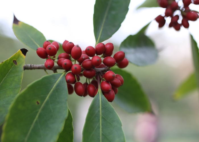 12、冬青(果):冬青属家族中的许多植物都具有很高的观赏价值,叶一年四季都呈现碧绿色,其果实颜色艳丽丰富,有正红、橘红、黑色等,每年秋冬季节果实开始变色,挂果期非常长,甚至能保持到翌年的早春。