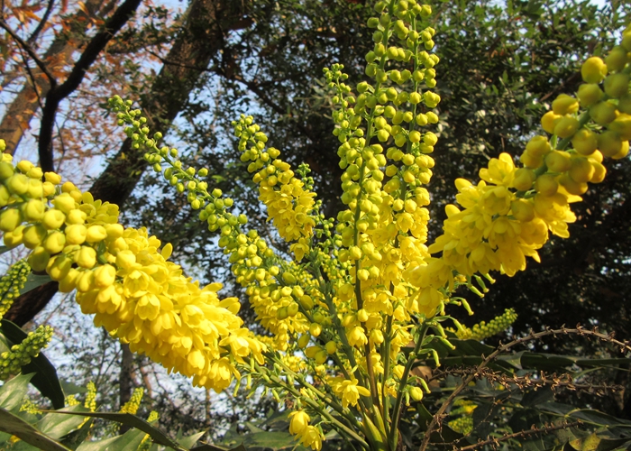 10、十大功劳:小檗科十大功劳属的常绿小灌木,枝干形似南天竹,花黄色,有香气。十大功劳凭着四季常绿、枝干挺直、叶形奇特、黄花密集等特色,具有独特的观赏价值,是草坪、假山、岩隙、河边的良好点缀树种,可作为林缘下木或绿篱应用,在长江流域广为栽培。