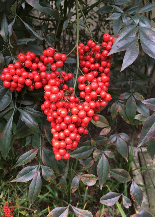 11、南天竹(果):南天竹,别名:南天竺,小檗科南天竹属植物,因为有较耐荫、抗性强、耐修剪等特点,成为我国南方常见的木本花卉种类。由于其植株优美,果实鲜艳,更是冬季不可缺少的观果植物。