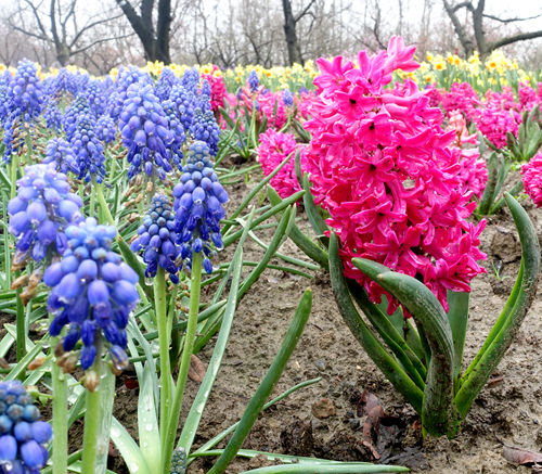 更为有意思的是,今年在上海植物园新改建的蔷薇园里,葡萄风信子和风信子被混种在了一起,有兴趣的游客可以仔细观察、比对一下两种花的区别。
