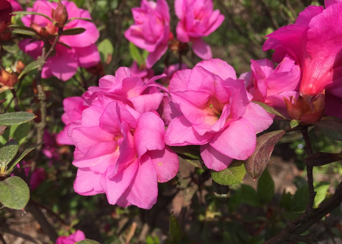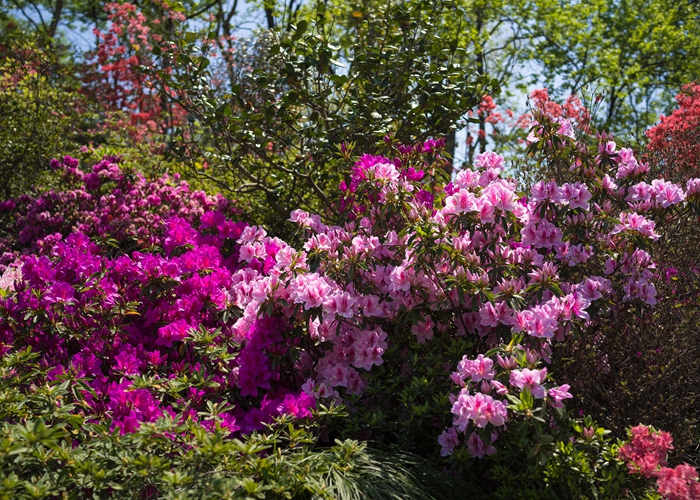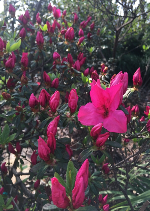 上植杜鹃园中就收纳有100多个品种。最早于3月开花的落叶杜鹃——迎红杜鹃;4月初开放的常绿杜鹃——马缨杜鹃、红晕杜鹃、马银花等;4月中旬开花的映山红杜鹃、毛白杜鹃等。更有珍稀种类供细赏,如:黄色系的落叶杜鹃——羊踯躅、橙红闹羊花、橙黄色的‘红枫’杜鹃;高山杜鹃类的云锦杜鹃、猴头杜鹃、长蕊杜鹃、鹿角杜鹃等;西洋鹃中的单瓣、套瓣及重瓣品种‘柳浪闻莺’、‘银边牡丹’、‘紫孔雀’等等。此外红色系的‘革命旗’、‘杨梅红’、‘村姑’;粉红色系的‘红宝石’、‘粉妆楼’、‘如意’;白色系的‘白百合’、‘风轮’;复色的‘鸳鸯凤冠’;紫色系的‘紫孔雀’、‘紫晶’;雪青色的‘秦娥’等品种也将竞相开放,花期可一直延续到5月中旬,此后再开者即为春夏鹃或夏鹃,其万紫千红的绮丽姿色不输于“花王”牡丹。花间四月天,记得带上相机4月中旬来上海植物园赏杜鹃。