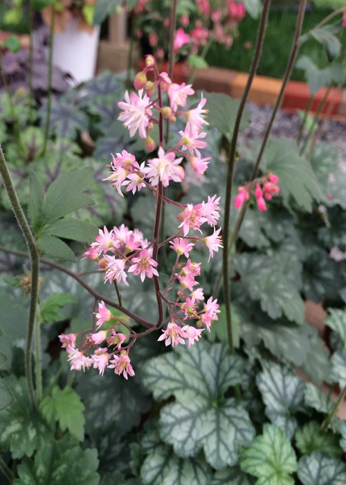 矾根叶美,花也毫不逊色,复总状花序,钟状小花,俏皮可爱, 4-6月开花,而且还有个好听的英文名字‘Coral Bells’(珊瑚钟)。它的花色虽然没有叶色那么繁多,但也不缺乏变化,既有娇艳欲滴的粉色、温暖明亮的黄色,也有热情似火的红色、纯洁无瑕的白色等。