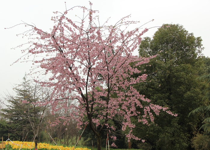 大寒樱除了树型高大,花量大,还有一大特色,花色随着开放至谢落过程中,由淡红逐渐变深,特别是雄蕊的花丝会变红色,花中心的瓣色会变深一些,花色更为明艳,不同一般樱花花色逐渐变淡或变成粉白色,整体观赏更为动人!