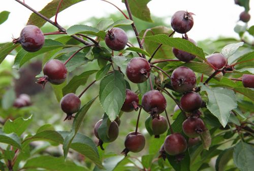 看!那青涩的花红(又名沙果),翠绿的果面上已透出一点羞涩的粉红,它凭借“大个头”称霸了蔷薇园!‘芭蕾舞美人’的果实,紫红色,仿佛已熟透的样子,果实大小可与沙果一较高下;那枝条上密集挂着像紫葡萄一样的是‘凯尔斯’海棠,它不仅开花量大,着果也这么多,绝对可称得上是“劳模”!而最能引人垂涎的还得数‘赛尔科’海棠,它那红里透亮的果实俨然就是“迷你版”的苹果。上述这些可都是血统纯正的小苹果哦,因为它们的果脐上都残留着萼片。