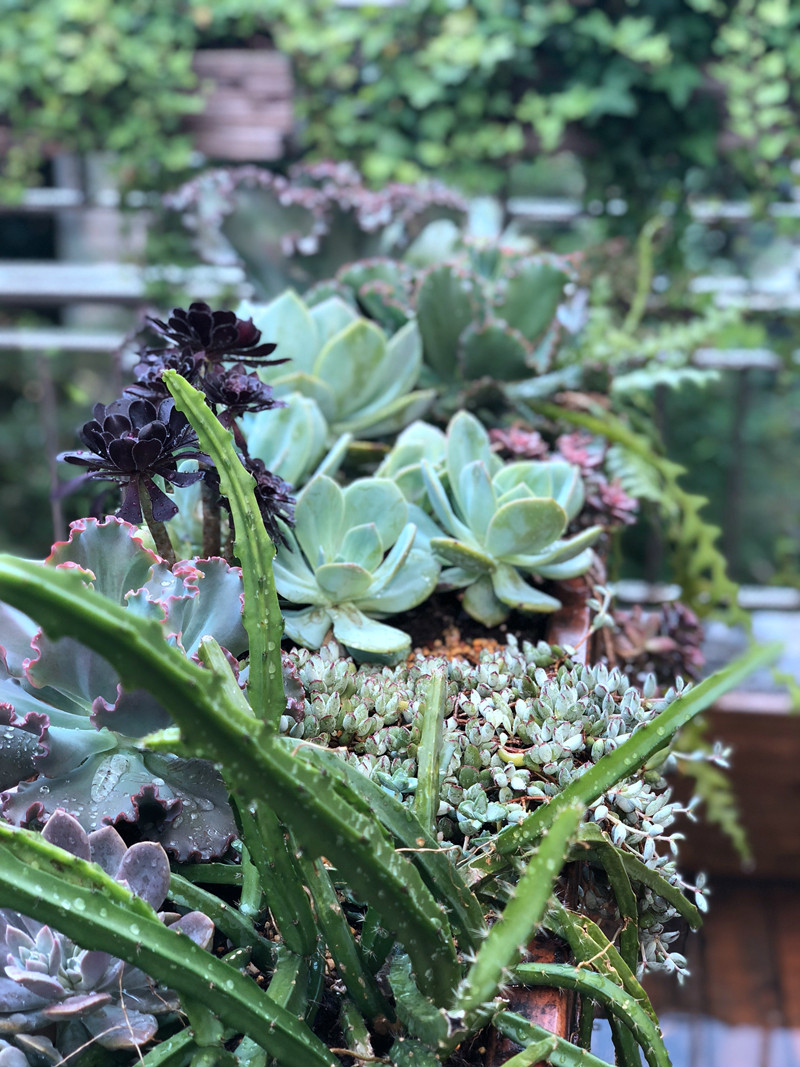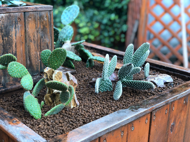 通过植物的替换,和园艺设施的位置变换,打造了一个欧式风情的多肉花园。在植物应用上,我们摒弃了传统的以单一景天科植物造景的传统,将多种多肉植物有机结合,并首次将附生类仙人掌和爬藤类仙人掌应用其中,增加了景观的层次感,刚柔并济,打破了原有的单一线条。共计种植了景天科植物15种,仙人掌科植物11种,以及夹竹桃科植物、龙舌兰科植物各一种。而在配饰的选择上,更是突破性得运用了水族景观中常用的松皮石和木化石。松皮石那极具冲击性的线条,让景观增添了风蚀效果,与仙人掌的结合更有一种与时间共存的感受。可谓一花一世界,一肉一庭院。