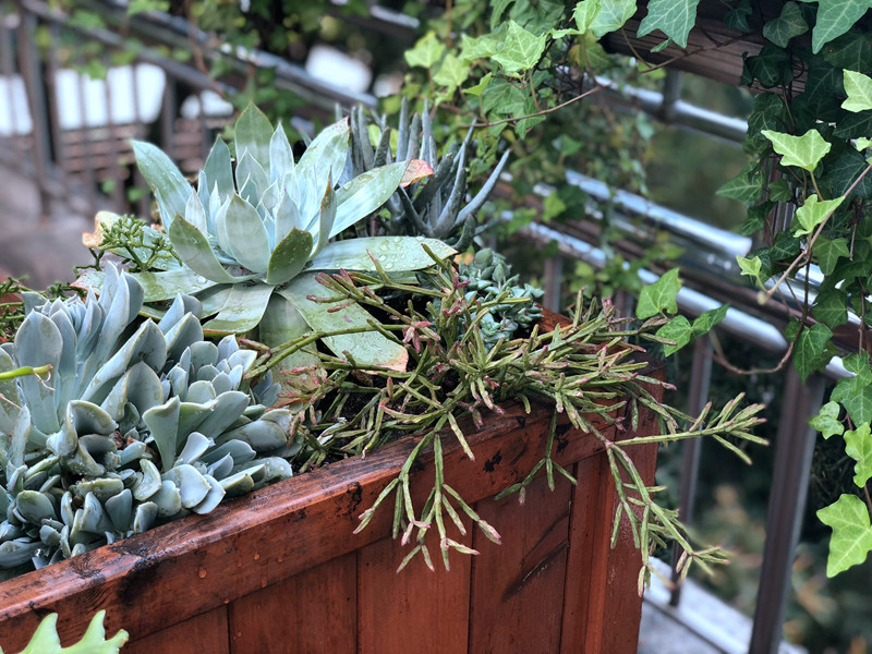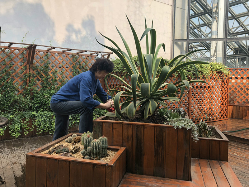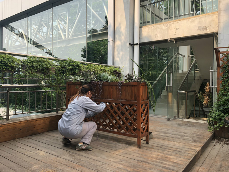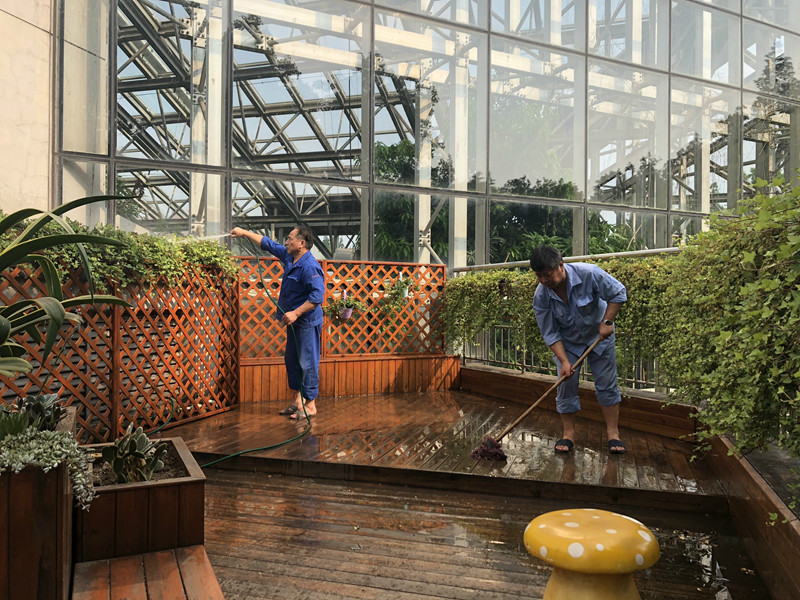为了让屋顶花园能在精致中透露一些沧桑感,温室员工将整个花园的木地板进行了全面的冲刷和清洗,让木地板的纹路更清晰,拥有着老时光的陈旧感。